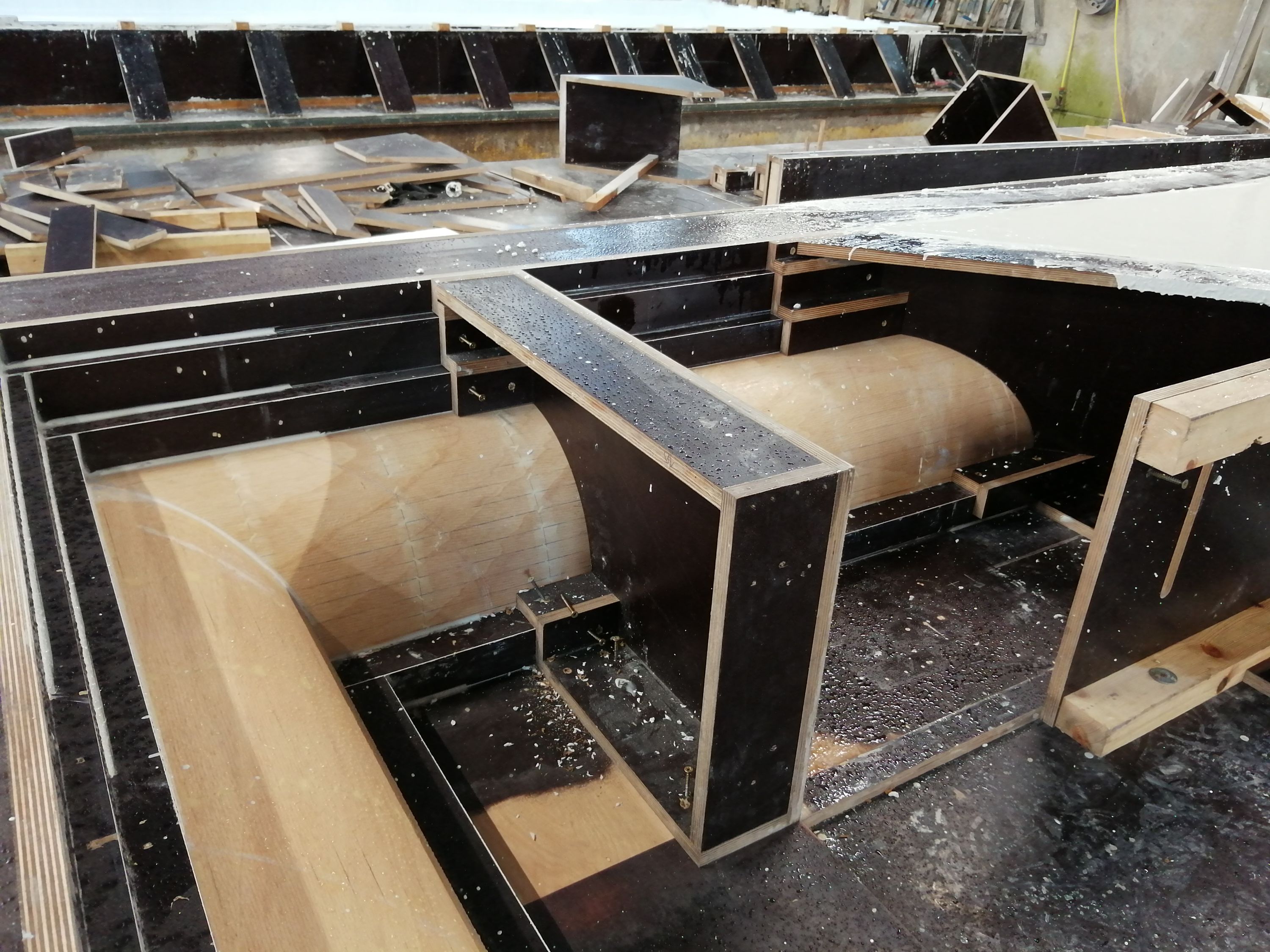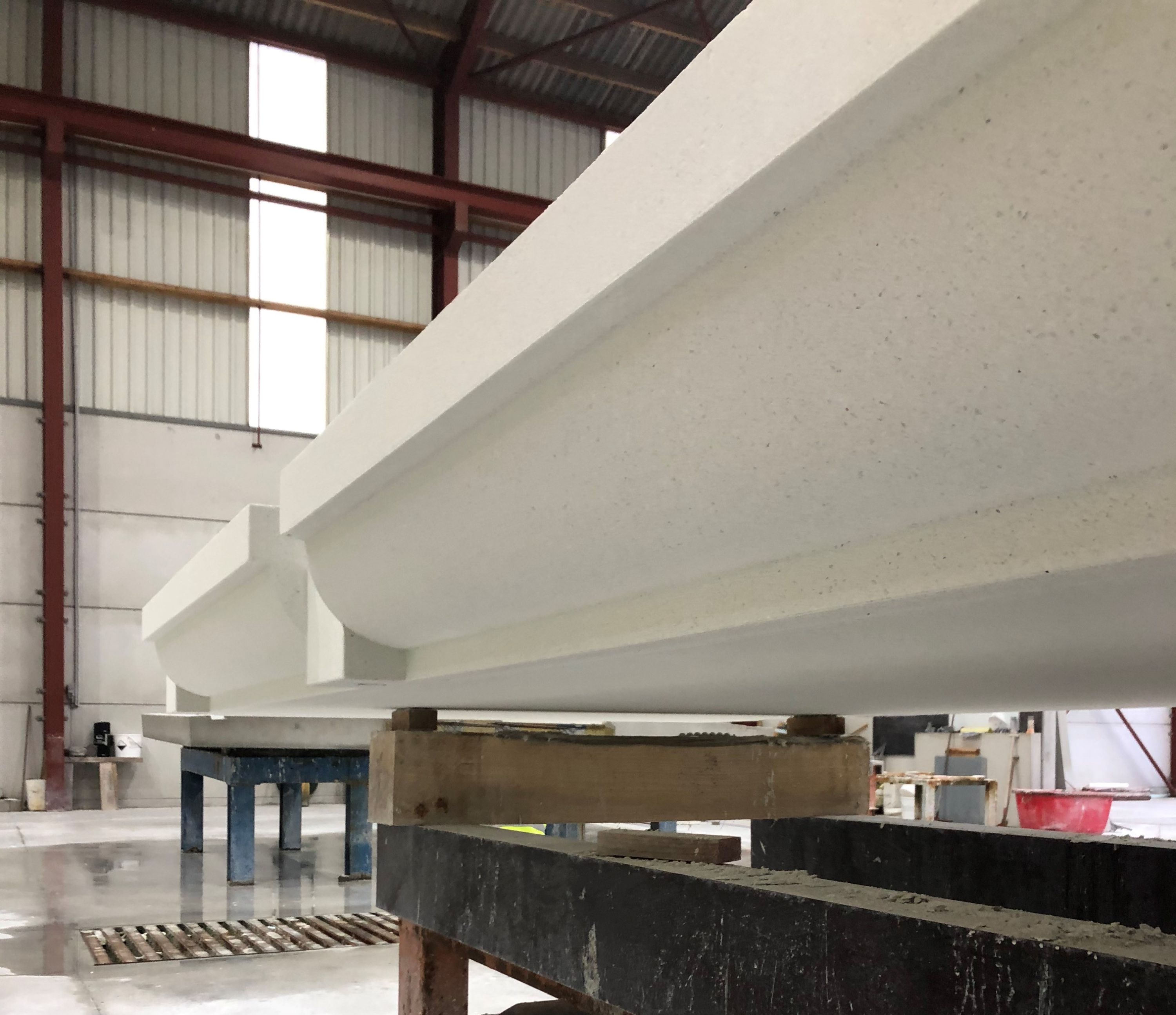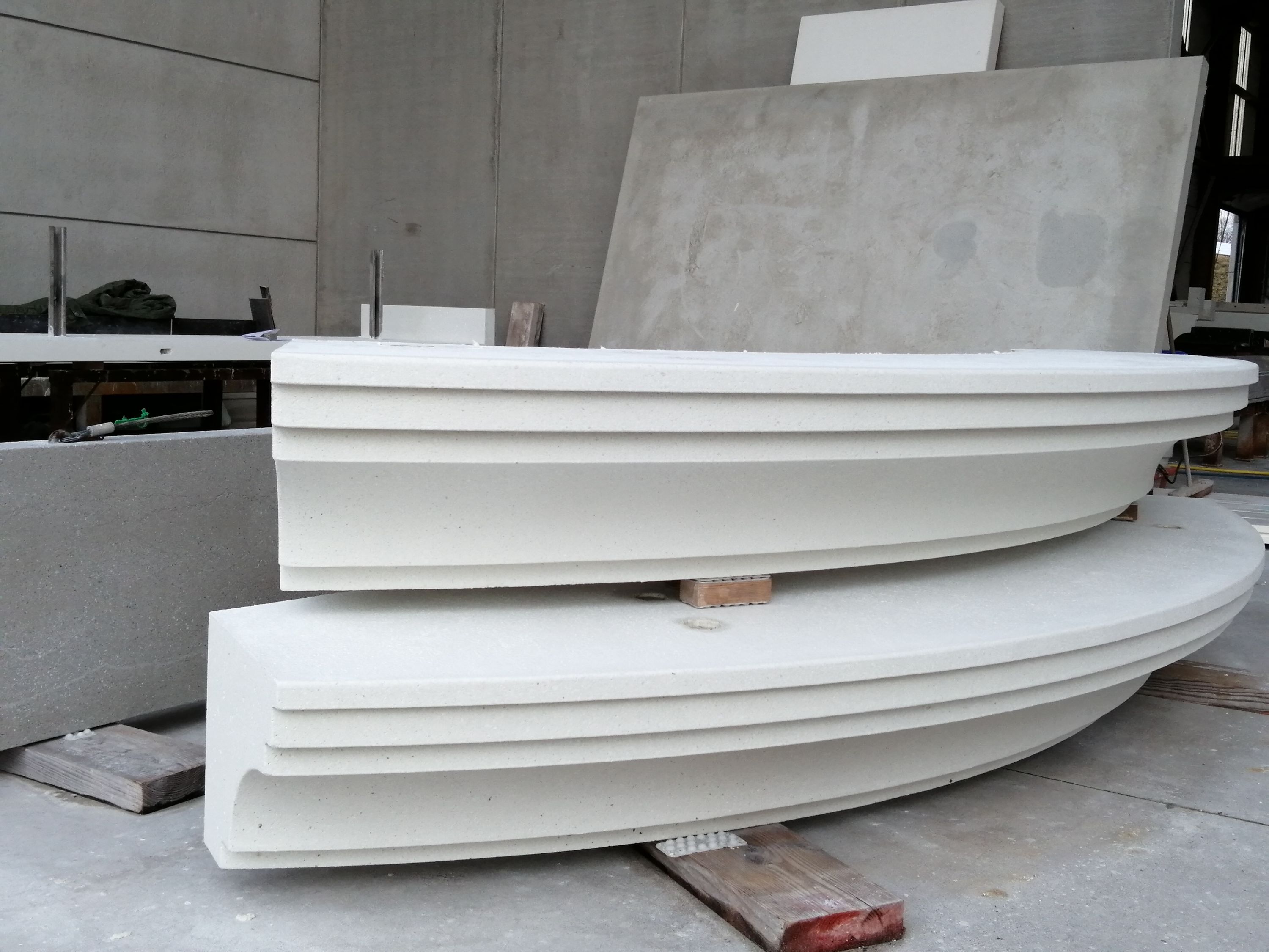 Door middel van ons hedendaagse tekenpakket kon elk element afzonderlijk bemaat en gewapend worden. Onze uitgebreide legplannen en stuktekeningen vormden hier de brug tot een goede en efficiënte communicatie met de aannemer. Ook tijdens productie konden we deze sierlijke driedimensionale vormgevingen correct vervaardigen. Onze CNC-machine werd optimaal benut voor het meer nauwkeurige freeswerk van de houten bekistingen. Maar voor de meest complexe elementen waren deze conventionele bekistingsmethodes in hout nog steeds ontoereikend. Hier werd er een oplossing gevonden in samenwerking met Twinplast. De mallen voor de bekisting werden in een geëxpandeerd polystyreen met hoge densiteit vervaardigd om zonder vervorming voldoende drukweerstand te kunnen bieden aan het eigengewicht van het beton.
