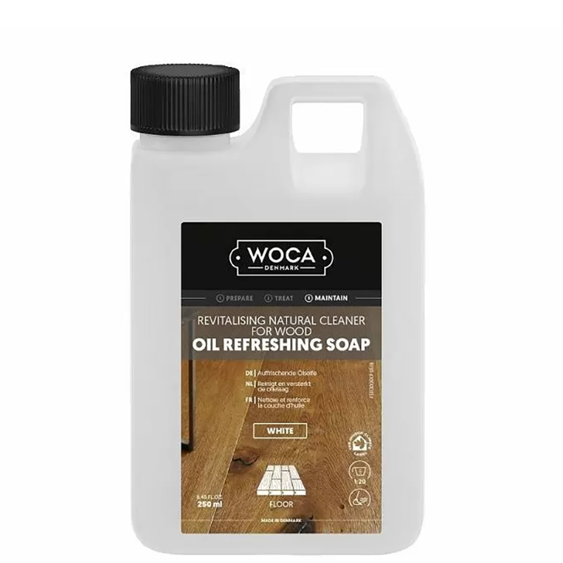 Voor de wekelijkse schoonmaak gebruik je best Woca Natuurzeep. Deze zeep voedt het hout en laat een beschermlaagje achter in de poriën. Zo blijft het oppervlak resistent tegen vlekken en vocht.