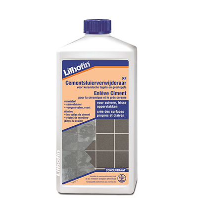 Verwijder resten van bouwvuil en cementsluier met Lithofin KF Cementsluierverwijderaar. Deze eenmalige schoonmaak is nodig voordat het reguliere onderhoud wordt opgestart.
