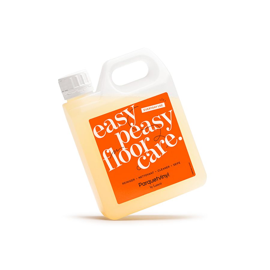 Voor de wekelijkse schoonmaak gebruik je best een speciaal afgestemd product zoals Easy Peasy Floor Care. Deze pH-neutrale reiniger is ontwikkeld voor Parquetvinyl en verwijdert vuil zonder de beschermlaag van je vloer aan te tasten.